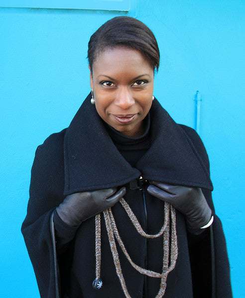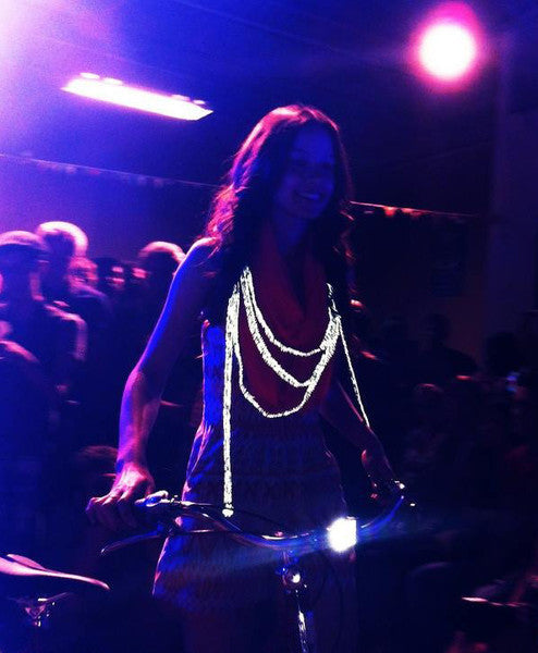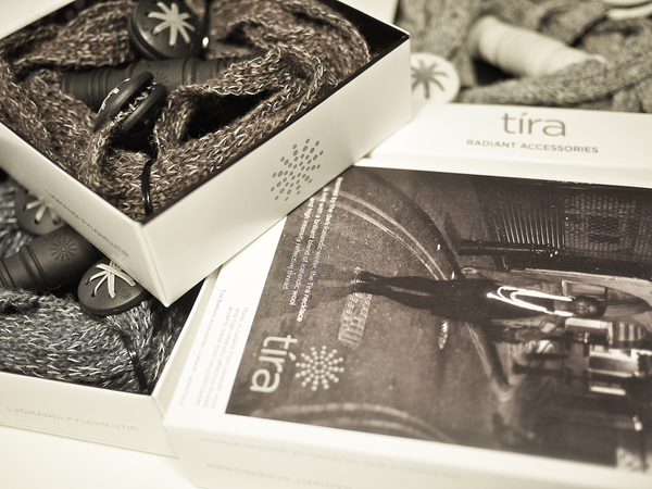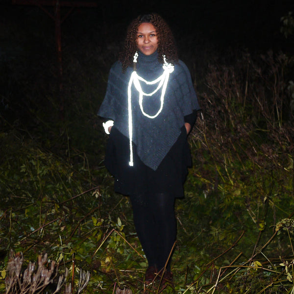 The Tíra Radiant Necklace is knit locally from a brilliant blend of Icelandic wool (Lopi) and a high-intensity reflective thread. The buttons and decorative cylinder are made from recycled rubber. The design of the cylinder is based on the traditional Icelandic decorative tassel cylinder of the tail-cap which is part of the Icelandic national costume. Wear as a stylish accessory during the day, and improve your visibility at night.
